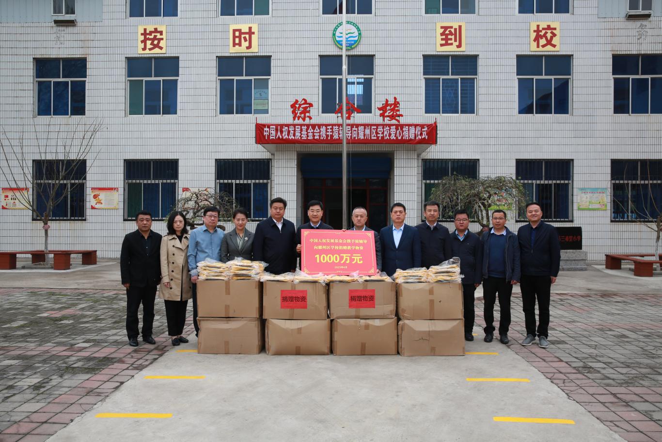中国人权发展基金会在庙湾镇柳林小学捐赠仪式上,向耀州区学校捐赠物资价值1000万元。