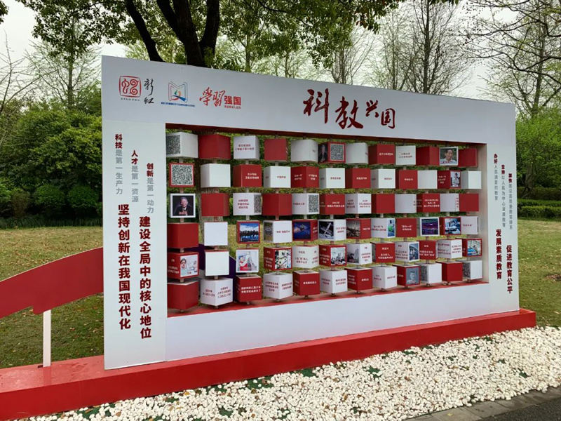 新虹街道新时代文明实践园“科教兴国”互动魔方墙。新虹街道新时代文明实践分中心供图