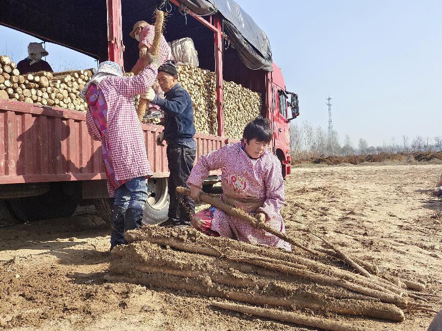 孙六镇龙门寨村山药种植基地内工人们正在装车。卢倩 摄